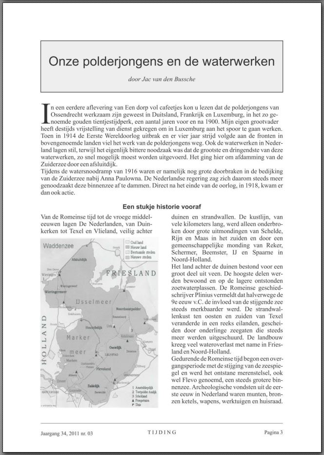 Jac van den Bussche heeft vele artikelen voor de Tijding geschreven. In Tijding 2011-3 stond: Onze polderjongens en de waterwerken.